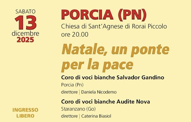 PORCIA – Sabato 13 dicembre 2025 alle ore 20.00 presso la Chiesa di Sant’Agnese in Rorai Piccolo a Porcia, si terrà il Concerto Natale, un ponte per la pace del coro Voci Bianche “Salvador Gandino” e del coro “Audite Nova” di Staranzano (Go), diretti da Daniela Nicodemo e Caterina Biasiol. I piccoli cantori saranno per l’occasione accompagnati dal pianoforte di Federico Maso. L’evento è inserito nella rassegna Purlilium Natale 2025 del Comune di Porcia e nel cartellone di Nativitas Fvg 2025.