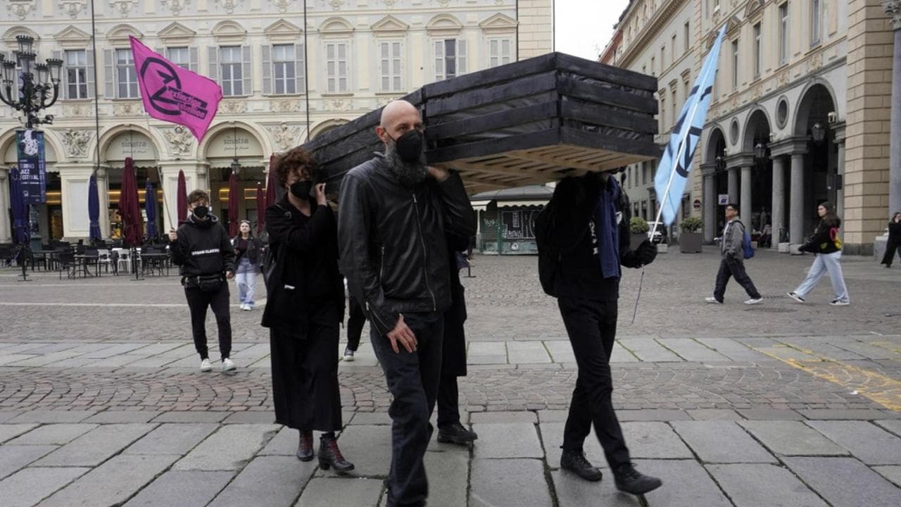 Una bara e una bombola a ossigeno hanno accolto, questa mattina, i consiglieri regionali arrivati a Palazzo Lascaris a Torino per la seduta di consiglio. È l’azione degli attivisti di Extinction Rebellion per denunciare “la mancanza di politiche strutturali per la riduzione dell’inquinamento atmosferico e la paralisi dei lavori a causa dello scandalo Chiorino-Delmastro”.