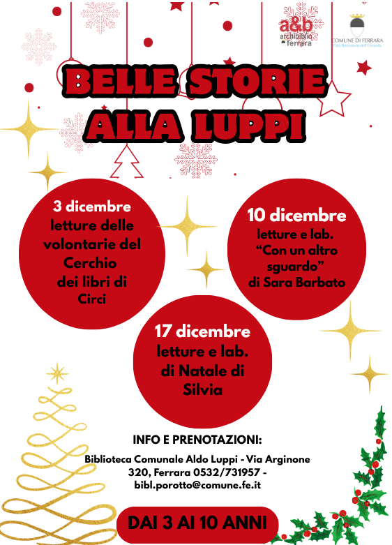 Proseguono gli appuntamenti per i più piccoli con le “Belle Storie” dedicate al Natale  alla biblioteca comunale Luppi (via Arginone 320, Porotto). Il prossimo incontro è in programma per mercoledì 10 dicembre 2025 alle 17:00 con “Letture con un altro sguardo” e a seguire laboratorio natalizio a cura di Silvia e Greta.
