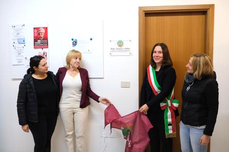 Nelle foto, alcuni momenti dell’intitolazione di stamattina. Nell’immagine principale, l’assessore Coletti insieme a Ivana, moglie di Gianni Artini, e le figlie Erika ed Elisa