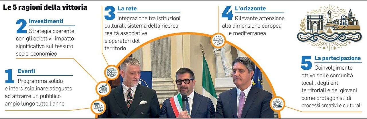 ANCONA «Non è un lutto, avete vinto». Dev’essere stata l’espressione monolitica del sindaco Silvetti ad aver suggerito la battuta al ministro Giuli. Appena dopo la proclamazione, ha invitato il primo cittadino a sciogliere la tensione accumulata nell’intensa mattinata romana. Sì, Ancona è sul tetto d’Italia: è Capitale della Cultura 2028. L’annuncio ieri mattina alla Sala Spadolini del Ministero della Cultura.