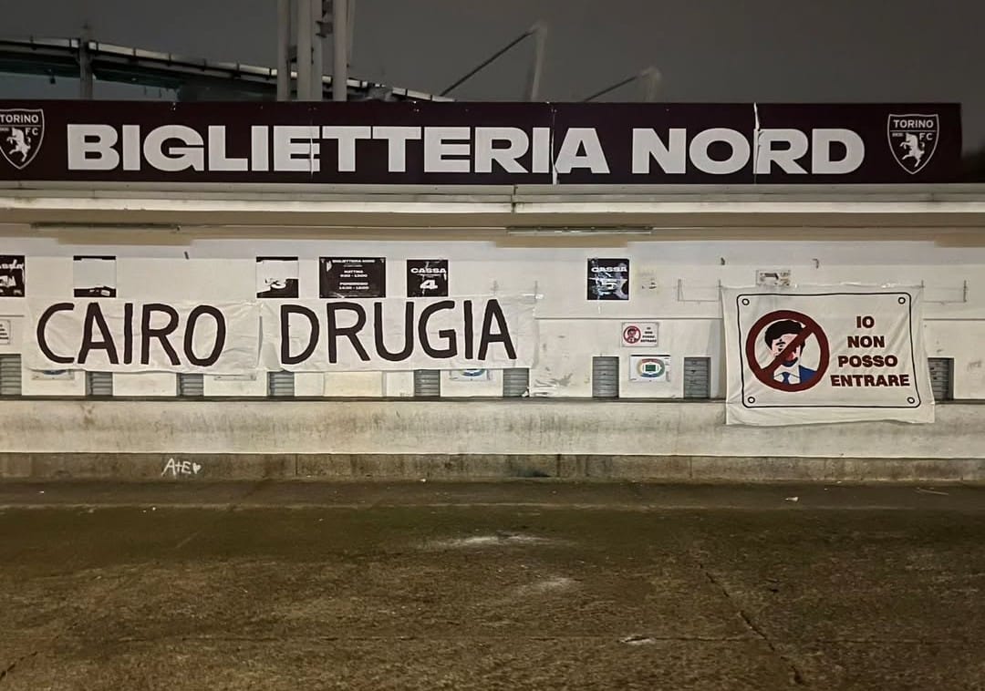 Nemmeno l’esonero di Marco Baroni (con l’arrivo di Roberto D’Aversa sulla panchina granata) ha placato l’ira dei tifosi del Toro. Nelle scorse ore, infatti – con il favore delle tenebre – alcuni ultras hanno appeso uno nuovo striscione ai cancelli del vecchio Filadelfia. Un manifesto inequivocabile con il viso di Urbano Cairo sbarrato e la scritta “Io non posso entrare” e la scritta “Cairo Drugia”