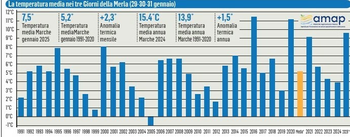 Che tempo ci aspetta nell’ultima settimana di gennaio? Entriamo nel periodo clou dell’inverno, quello che include i Giorni della Merla, gli ultimi tre di gennaio che la tradizione popolare vorrebbe come i più freddi dell’anno. Nel 2005 fecero rabbrividire i marchigiani, con una temperatura media regionale di un grado sotto lo zero nelle 72 ore che chiudevano il mese. Memorie degli inverni di una volta, uscite da una capsula del tempo, mettendo i dati a confronto con il 29-30-31 gennaio dello scorso anno, che nelle statistiche dell’agenzia regionale Amap fecero registrare 9,7° nella media dei tre giorni considerati. Ben 4,6° in più dello standard (5,1° C) dei Giorni della Merla del trentennio 1991-2020, il periodo storico di riferimento preso come parametro per misurare i cambiamenti climatici. E oltre 10° in più di quel minimo storico registrato vent’anni prima.