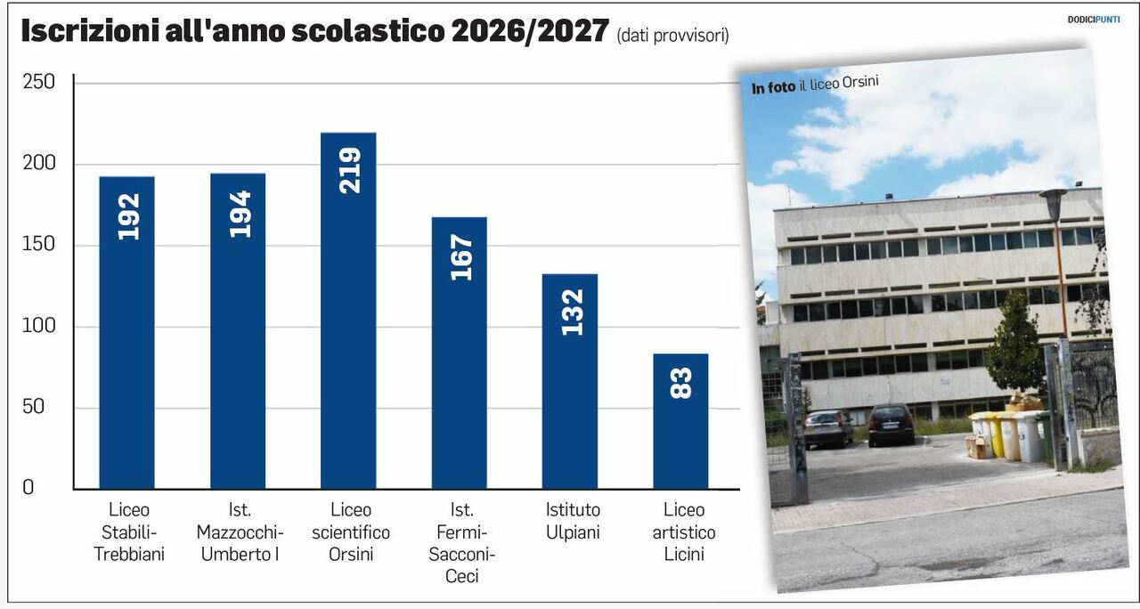 Nel comparto tecnico e professionale, l’istituto Mazzocchi-Umberto I rappresenta l’unica vera eccezione positiva: il polo raggiunge i 198 iscritti totali. E con questo risultato la scuola riesce a superare numericamente lo Scientifico Orsini, posizionandosi come il secondo centro cittadino per volume di iscritti. Altrove, il settore soffre di più. L’istituto Fermi-Sacconi-Ceci registra il calo più importante, passando da 167 a 117 allievi, con una variazione negativa superiore al 30%. Anche l’Ulpiani subisce una contrazione, fermandosi a 108 iscritti complessivi. Il liceo artistico Orsini Licini chiude il quadro con una lieve flessione, attestandosi a 75 preferenze. L’analisi comparativa evidenzia come i licei mostrino una maggiore resilienza e stabilità, presentando variazioni meno brusche e una capacità di compensazione interna tra i vari indirizzi. Gli istituti tecnici manifestano invece un andamento molto più volatile. In termini assoluti, quindi, i percorsi liceali rimangono stabilmente l’indirizzo con il maggior numero di iscritti complessivi nella città, distanziando i poli tecnologici e agrari che accusano una flessione.