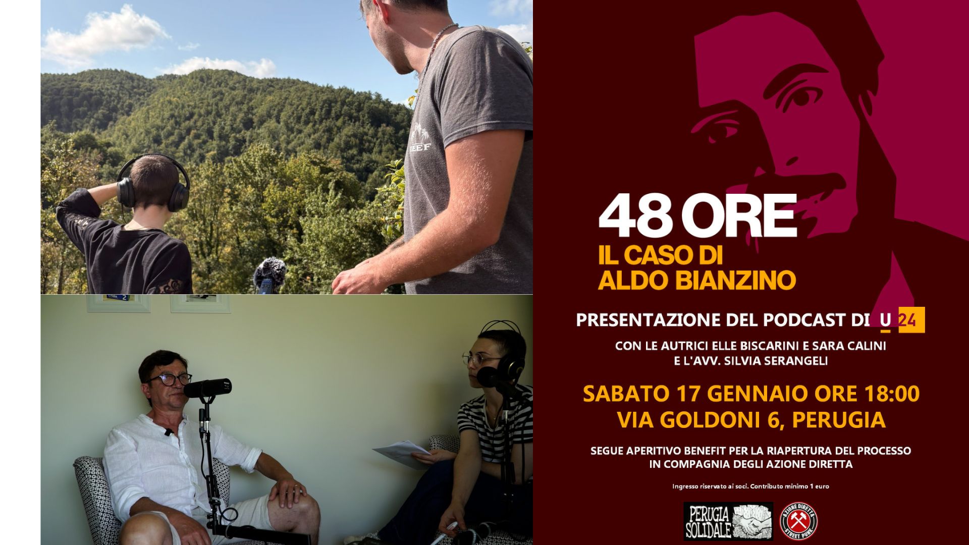 A presentare il podcast, le giornaliste e autrici Elle Biscarini e Sara Calini, e l’avvocata Silvia Serangeli, che ha messo a disposizione le sue competenze supervisionando il lavoro di scrittura da un punto di vista legale. La serata prosegue in compagnia del gruppo Azione diretta, autore del brano ‘Frana la curva‘, che apre il primo episodio della serie, con un aperitivo di raccolta fondi a sostegno della richiesta di riapertura delle indagini per omicidio colposo presentata da Rudra Bianzino, figlio di Aldo, oggi in attesa di una risposta dal Tribunale di Perugia.
