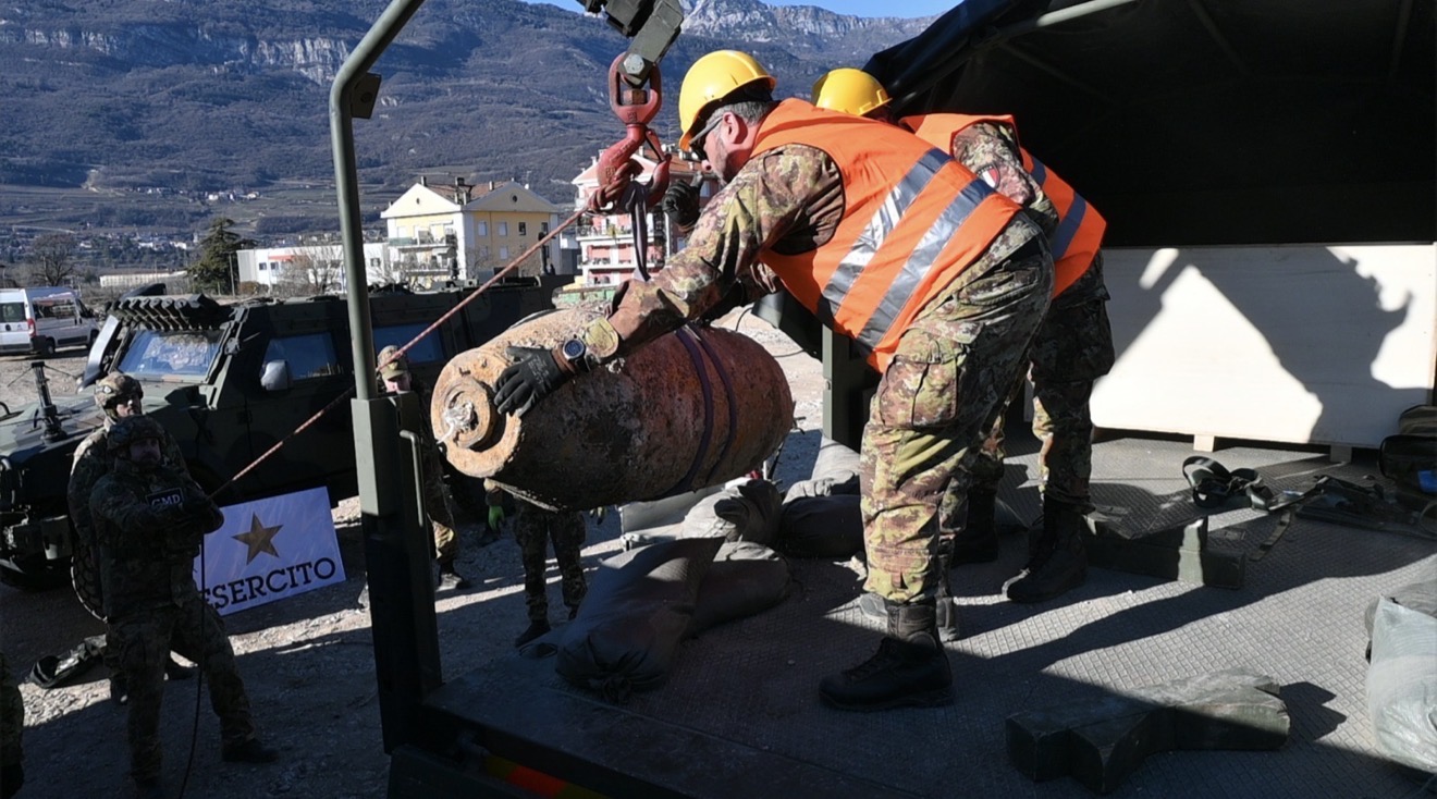 In mattinata gli specialisti dell’esercito avevano preparato con cura l’intervento, utilizzancdo anche dei piccoli robit cingolati per il trasporto delle attrezzature. La bomba è poi stata caricata sul camion e portata verso la bassa Vallagarina.