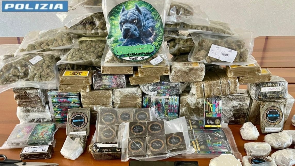 Le chiavi hanno condotto gli investigatori a un’abitazione nella disponibilità degli indagati, dove è stato scoperto un vero e proprio deposito di sostanze stupefacenti. All’interno sono stati sequestrati circa 8,6 chilogrammi di hashish e 2,4 chilogrammi di marijuana, oltre a strumenti per il confezionamento e la pesatura e 645 euro in contanti, ritenuti provento dell’attività illecita.