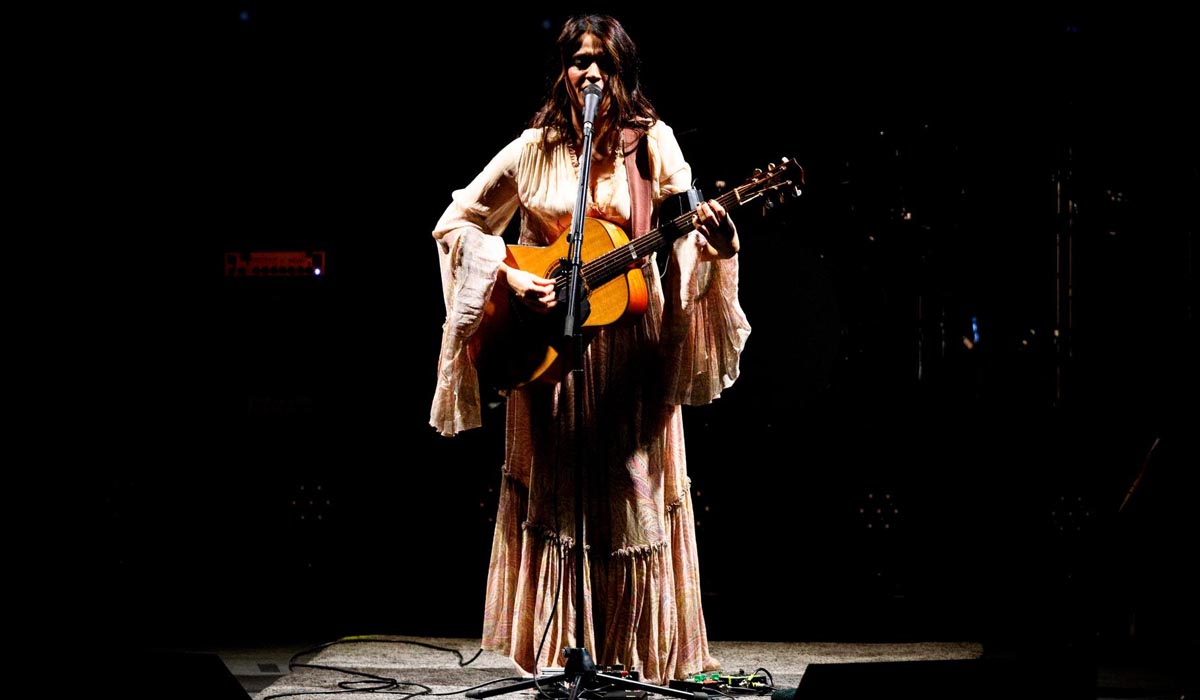 È un’atmosfera suggestiva e immersiva ad aprire il set, tra le parole fuori campo e le immagini (a cura di Giuseppe Lombardo), con il suono del mare e le sue sfumature cromatiche che avvolgono il palco. Quindi, l’attacco con la splendida “Amuri luci”, struggente dedica a Giovanni Impastato, che ha speso la sua vita a ricordare il fratello Peppino, vittima della mafia. L’intreccio mediterraneo tra le chitarre e gli inserti di mandolino, marranzanu e zufolo asseconda magnificamente l’interpretazione dolente di Carmen Consoli, in veste bianca da musa greca con chitarra a tracolla, investita dai giochi di luce. A differenza dell’ultima esibizione romana a cui abbiamo assistito – il 26 dicembre 2021, ancora in piena era Covid, tutti imbavagliati con mascherine Ffp2 – la Cantantessa non si concederà molto alle chiacchiere, se non nella seconda parte del set.