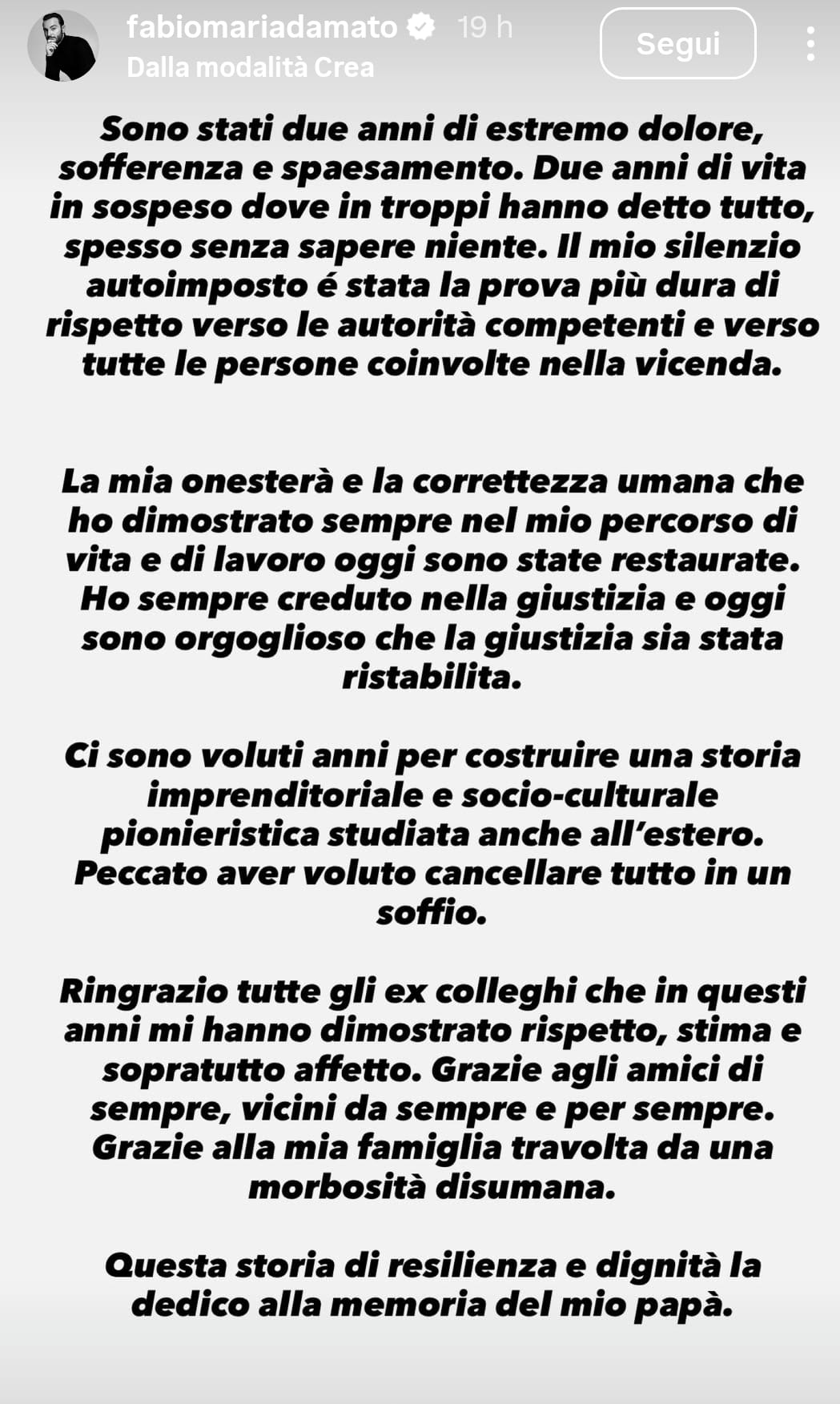 È sempre stato monitorato mediaticamente, ma il braccio destro di Chiara Ferragni, Fabio Maria Damato, negli ultimi travagliati anni si è visto poco e niente. È stato sempre in silenzio. Fino al post Instagram pubblicato nelle scorse ore. Nessun video in lacrime, nessun selfie con gli occhi lucidi. Un asciuttissimo post nel quale si racconta in breve, ma nero su bianco: “Sono stati due anni di estremo dolore, sofferenza e spaesamento. Due anni di vita in sospeso dove in troppi hanno detto tutto, spesso senza sapere niente. Il mio silenzio autoimposto è stata la prova più dura di rispetto verso le autorità competenti e verso tutte le persone coinvolte nella vicenda”.