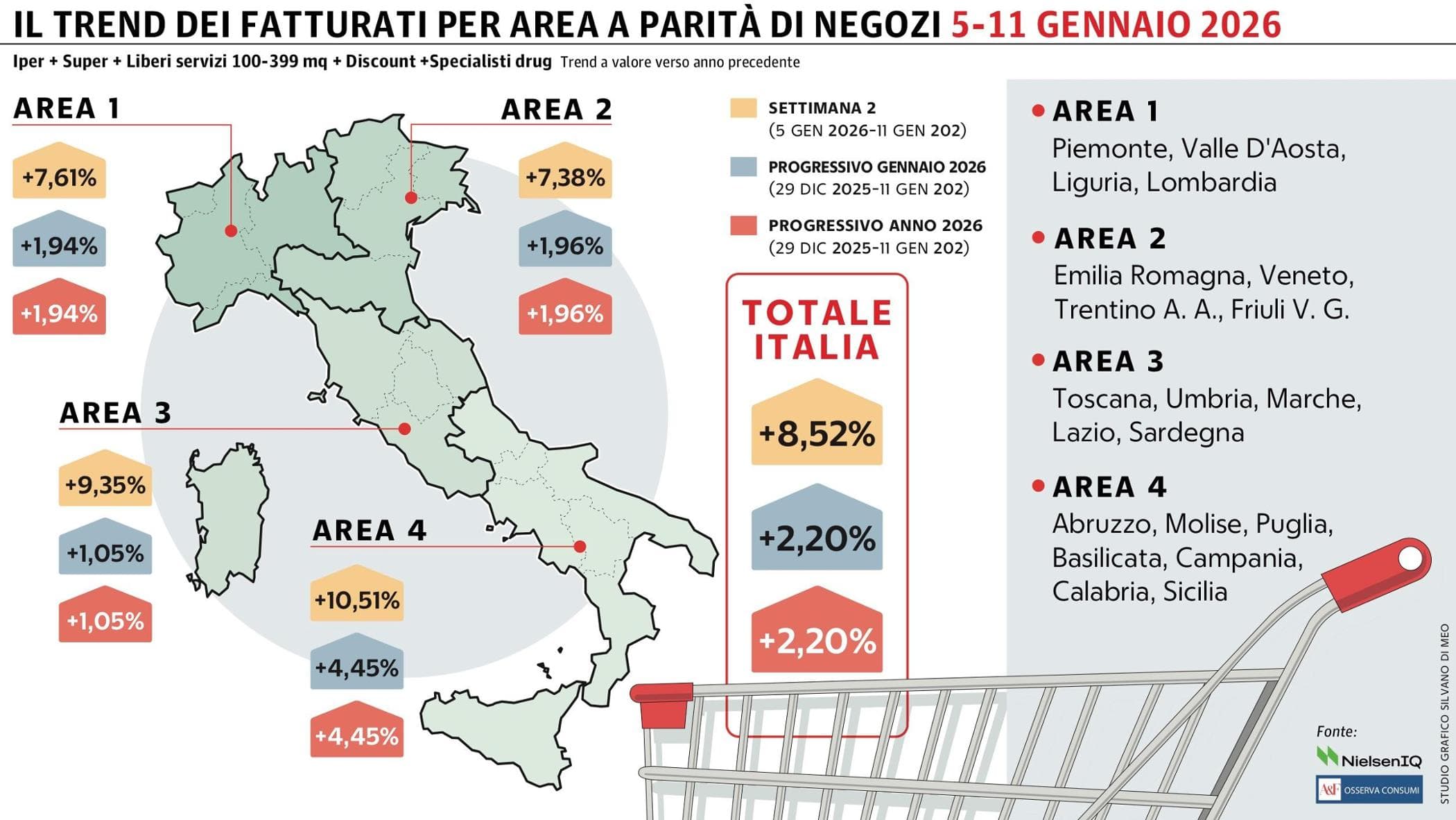 Gdo italiana in ripresa nella seconda settimana di gennaio: dopo la flessione del 2,33% della precedente rilevazione, tra il 5…