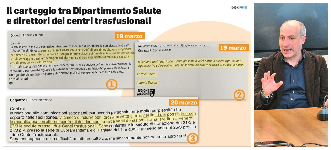 Anche il governatore Acquaroli conferma l’intento di «fare chiarezza» con una commissione di verifica «che io per primo ho chiesto all’assessore di istituire, e se ci saranno responsabilità verranno segnalate agli organi competenti. Quello che c’è scritto nell’articolo non solo è grave, è inaccettabile. Non è però il caso di strumentalizzare». Nella ricostruzione fatta da Calcinaro, affiancato dal direttore del Dipartimento Salute Antonio Draisci, viene spiegato che «la criticità era stata segnalata dal Dipartimento regionale di medicina trasfusionale, cioè la struttura regionale che coordina le attività di lavorazione e gestione di sangue e plasma derivati, a causa dell’assenza contemporanea di due dipendenti nei primi giorni di marzo».