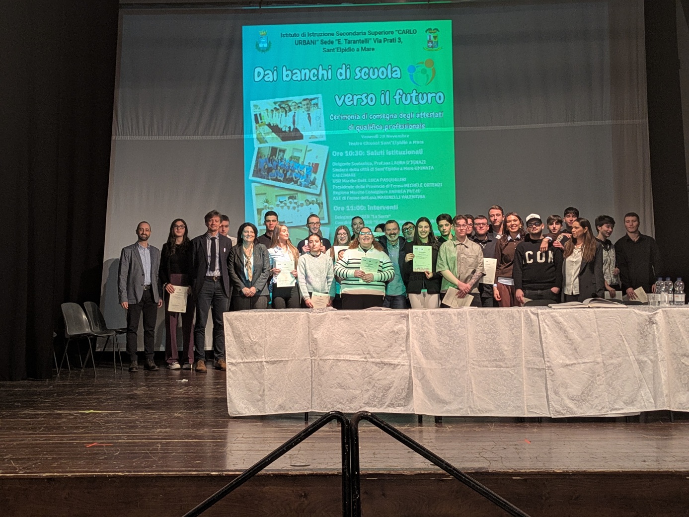 Si è tenuta ieri mattina, presso il teatro Cicconi di Sant’Elpidio a Mare, la cerimonia “Dai Banchi di Scuola verso il Futuro 2025”, un appuntamento ormai consolidato e di grande rilievo per l’istituto “Tarantelli” del Polo Urbani. L’evento, presentato dalle professoresse Patrizia Baglioni ed Enrica Mataloni, ha celebrato il successo e la preparazione degli studenti, segnando ufficialmente il loro ingresso nel mondo del lavoro con la consegna degli attestati di qualifica professionale.