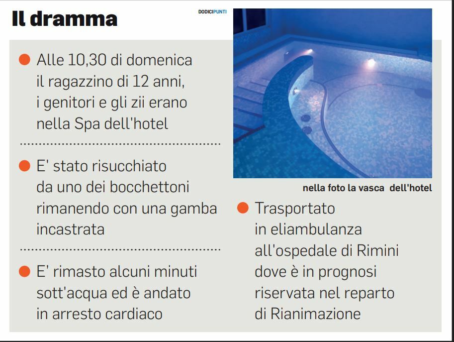 Erano circa le 10,30 del giorno di Pasqua: tutta la famiglia del ragazzino, originaria del Teramano ma residente a San Benedetto del Tronto, è scesa al pian terreno della struttura alberghiera della Valmarecchia, in provincia di Rimini. Un 4 stelle moderno, molto frequentato e apprezzato per i servizi offerti tra i quali, appunto, un’area benessere. Con la mamma si è immerso. Non in una vera piscina, ma in una vasca per idromassaggio, da pochi posti a sedere, con l’acqua non più profonda di un metro. Per motivi che sono in corso di accertamento da parte dei carabinieri, diretti dal tenente colonnello Claudio Scarponi, comandante della compagnia di Novafeltria, la gamba del ragazzino è stata risucchiata dal bocchettone della vasca. Il ragazzino è finito sott’acqua per alcuni, interminabili, minuti. Erano tutti intorno a lui, nella Spa: la mamma, il papà e gli zii.