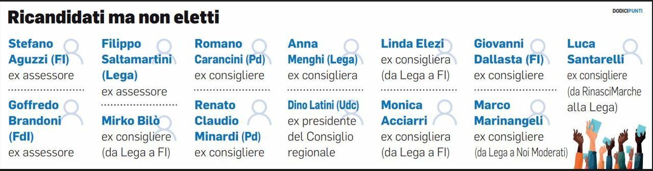 Sono 13 in totale, anche se l’ex assessore alla Sanità in quota Lega Saltamartini ha ottime chance di rientrare in aula: il collega di partito Marinelli è infatti ad un passo dall’entrare in giunta, cosa che gli aprirebbe le porte dell’aula. Altri non saranno così fortunati. Come i suoi ex compagni di banco a Palazzo Raffaello Aguzzi (FI) e Brandoni (FdI), che non hanno possibilità di rientrare in partita. C’è poi chi l’aula l’ha lasciata per scelta. È il caso del leghista Cancellieri, tornato di sua sponte a fare il medico di medicina generale, o le ex consigliere dem Bora e Casini, che a differenza di altri nel Pd non hanno corso per il terzo mandato. «È stata una scelta chiara la mia – spiega Casini – Non mi sarei ricandidata perché credo nel rinnovamento. Sono tornata a casa: all’ufficio Servizio Urbanistica e Pianificazione territoriale della Provincia di Ascoli. Avevo nostalgia del mio lavoro». Non tutti hanno chiuso l’esperienza con il Consiglio con una tale pace d’animo. Anzi, c’è chi il risultato deludente non l’ha proprio mandato giù.