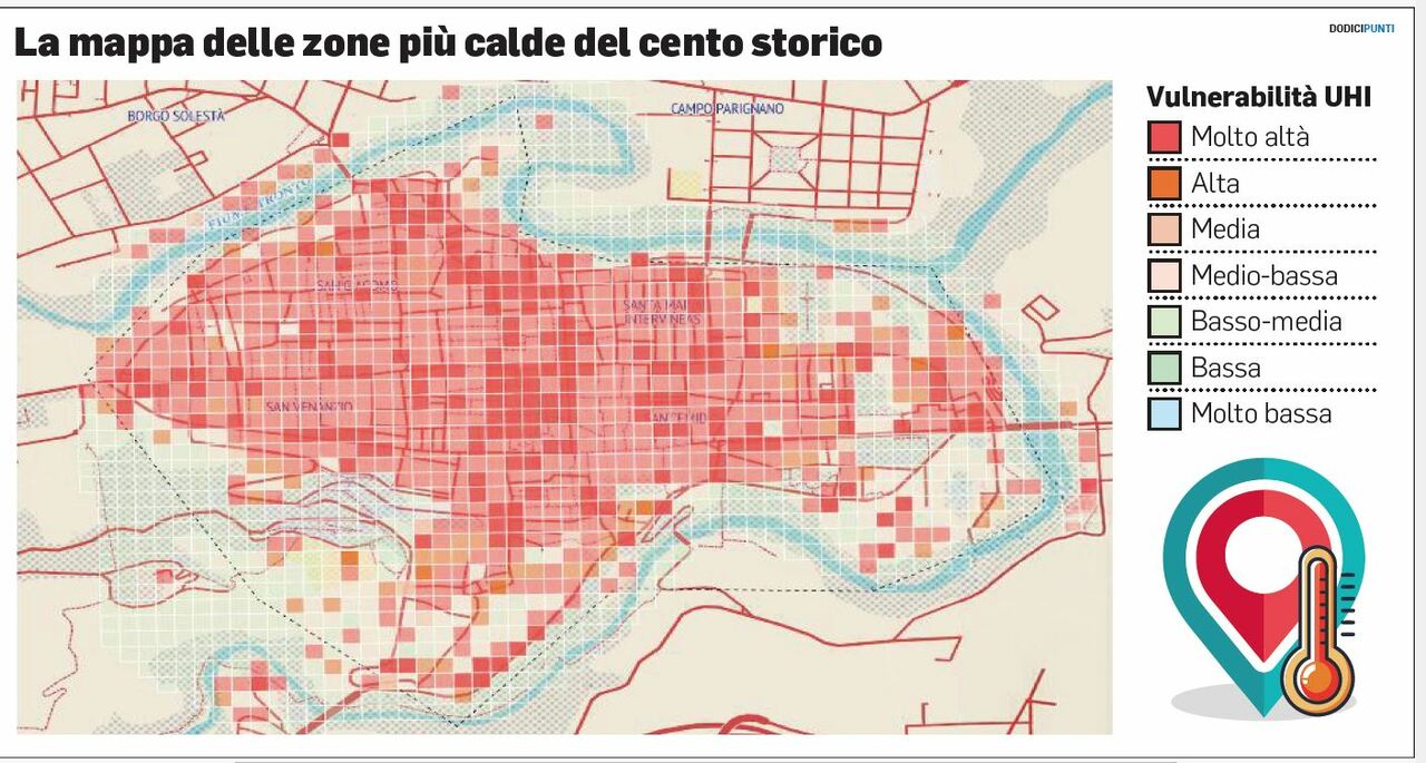 Per gestire il surriscaldamento, il gruppo di ricerca di progettazione ambientale e pianificazione urbana ha adottato un sistema internazionale di classificazione denominato Local Climate Zones (Lcz). Si tratta di una mappa climatica che divide la città in zone omogenee per caratteristiche fisiche che determinano il comportamento termico. Ad Ascoli, il progetto ha mappato il centro storico, con una risoluzione di 30×30 metri. Ma il valore innovativo del progetto di ricerca sta nel superare la sola analisi climatica per costruire una mappa di vulnerabilità multidimensionale, che integra dati di stress termico, densità di popolazione vulnerabile (bambini sotto i 5 anni e anziani oltre i 64 anni), permeabilità delle superfici e lo stato della vegetazione, e il rischio climatico locale: combinando quindi l’esposizione al calore con la fragilità della popolazione.
