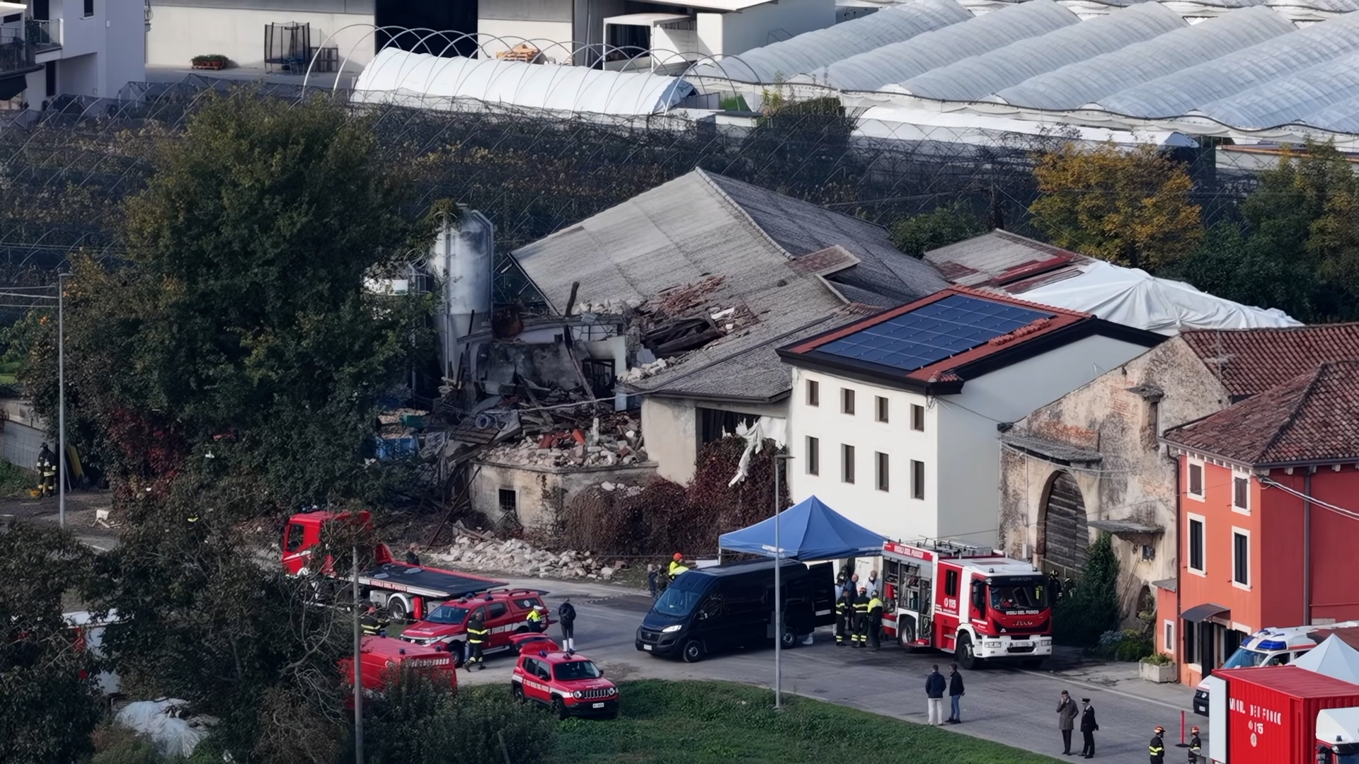 Le immagini dal drone girate a distanza del casolare di via San Martin, a Castel D’Azzano, nel Veronese, distrutto nell’esplosione in cui sono morti tre carabinieri. Una decina tra militari e agenti di polizia sono rimasti feriti. Nel casolare abitavano tre fratelli. Due di loro, Maria Luisa, 59 anni, e Dino Ramponi, 63, sono rimasti feriti nell’esplosione.