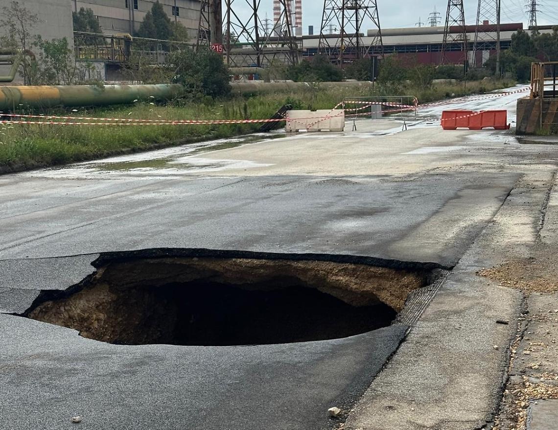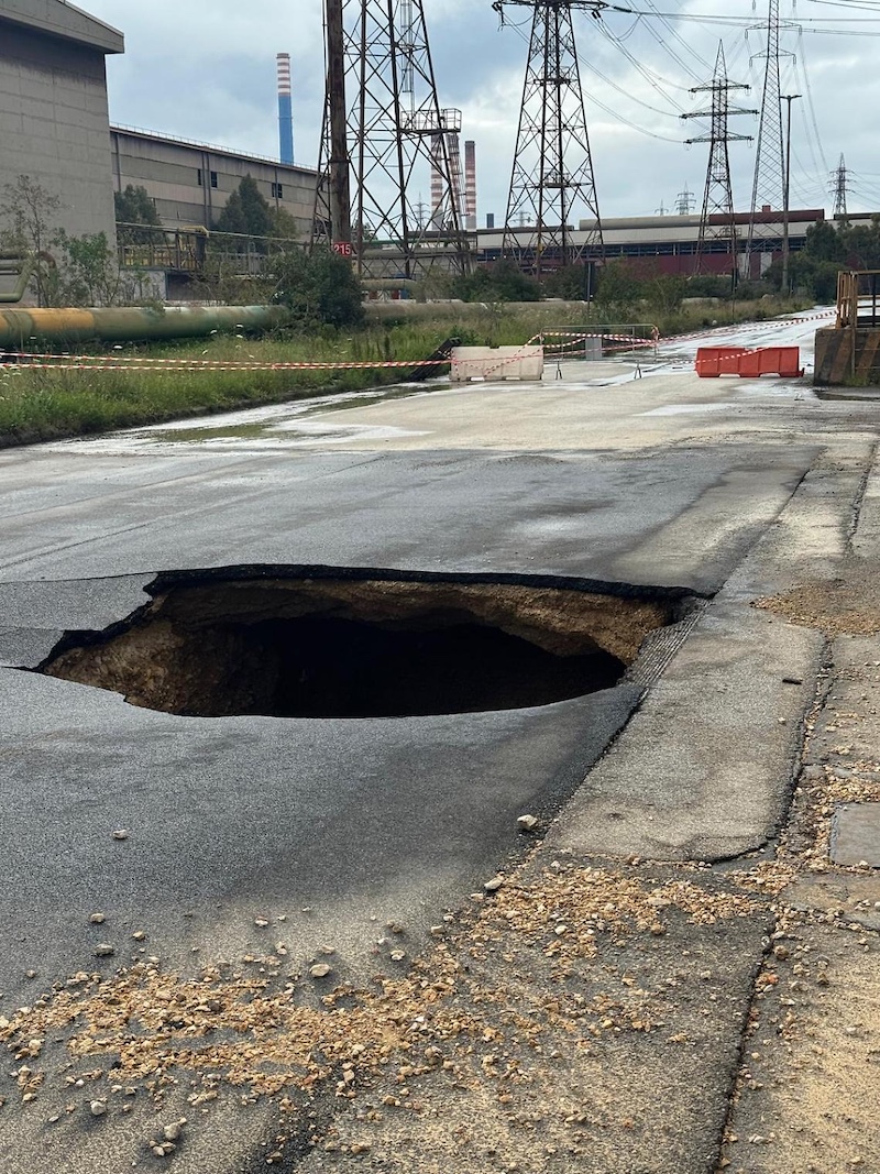 Il dissesto ha interessato una porzione della strada utilizzata quotidianamente da mezzi industriali e personale dello stabilimento. Nel punto in cui si è verificato il cedimento passa inoltre una tubazione interrata, circostanza che, secondo i rappresentanti dei lavoratori, avrebbe potuto aggravare le conseguenze dell’episodio.