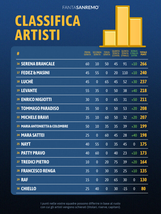Terza posizione per Sal Da Vinci, trascinato anche dai 100 punti di bonus per la vittoria del Festival. La sua ultima serata vale 200 punti complessivi: standing ovation totale, discesa in platea, accessorio rosso, papillon del direttore, esibizione dopo l’una, gesto delle dita a V e altri bonus che hanno reso il finale ancora più ricco. Il trionfo all’Ariston si è trasformato in un balzo decisivo anche al FantaSanremo.