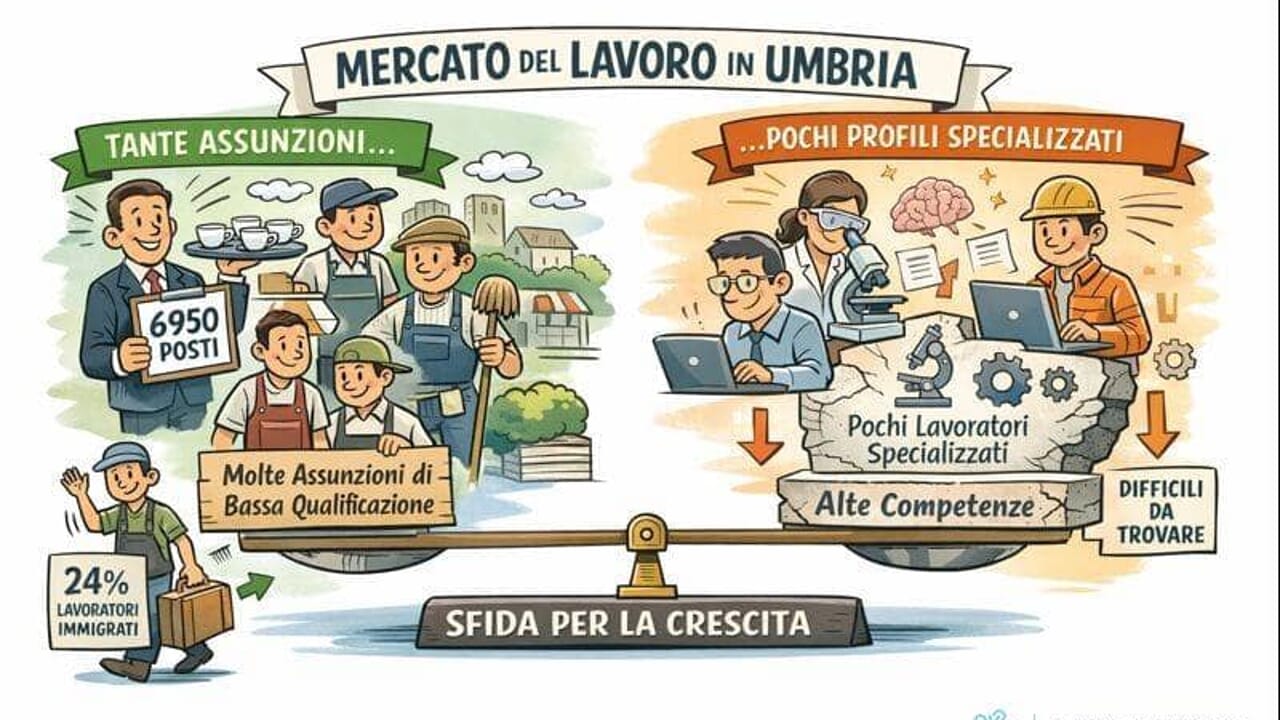 Il mercato del lavoro umbro mostra un doppio volto: un inizio d’anno tra i più brillanti d’Italia, seguito da un rallentamento che riporta il sistema in equilibrio, ma svelando al contempo un cambiamento strutturale profondo e preoccupante. È la fotografia scattata dai dati del Sistema Informativo Excelsior (Unioncamere-Ministero del Lavoro) per il primo trimestre del 2026, che raccontano di un’Umbria che crea posti di lavoro, ma sempre più spesso a bassa qualificazione, mentre fatica a far decollare le attività ad alto valore aggiunto, sia industriali che terziarie.