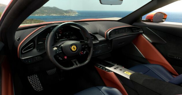 Al posteriore, la spider di Maranello monta un alettone mobile attivo integrato nella coda: le tre configurazioni migliorano le prestazioni e quella ad alta deportanza genera fino a 110 kg di carico in più a 250 km/h. Poi ci sono l’impianto frenante a segnali elettronici (break by wire) che Ferrari assicura essere in grado di “migliorare sensibilmente l’efficienza della frenata, ridurre la corsa del pedale e incrementare la modulabilità, anche nelle situazioni in cui interviene l’ABS”, la cui versione Evo è stata adeguata per “garantire prestazioni ottimali su tutte le superfici e in tutte le modalità del manettino”. Le sue cinque impostazioni consentono a chi sta al volante di scegliere fra Wet, Comfort, Sport, Race e ESC-Off. Implementato rispetto a quello impiegato sulla 296 GTB, la Amalfi Spider ha anche il sistema di stima del grip basato sull’EPS (Electric Power Steering) la cui velocità di apprendimento è superiore del 10% ed è “più accurata anche su superfici a bassissima aderenza”.