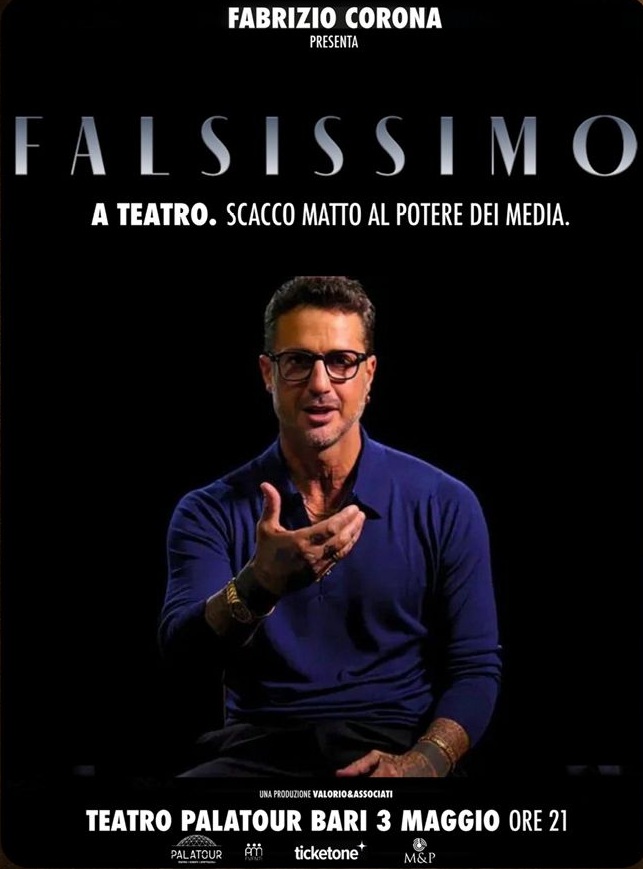 Dal web al palcoscenico, Fabrizio Corona va in scena con lo spettacolo ‘Falsissimo’. E tra le dodici tappe del suo tour c’è anche Bitritto, a pochi chilometri da Bari, in programma il prossimo 3 maggio alle 21. Lontano dai salotti televisivi e dai social, l’ex fotografo dei vip ha scelto la dimensione teatrale per proporre un monologo che promette di ripercorrere le tappe più controverse della sua carriera e della cronaca italiana recente.