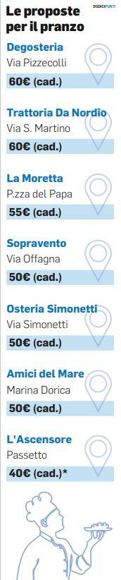 Chi fa menù fissi, propone un conto a persona che varia tra i 40 ed i 60 euro. La maglia rosa del pasto di Natale più attento alle tasche va all’Ascensore del Passetto, dove i due menù (di carne e di pesce) si mettono in tavola con “soli” 40 euro a testa. «Un prezzo abbordabile perché la crisi si sente, e la gente è un po’ terrorizzata dai conti» spiega la scelta Catalano. Aggiunge: «Rispetto all’anno scorso non abbiamo ritoccato nulla, dopo il Covid i prezzi delle materie prime erano schizzati alle stelle ma ora si stanno stabilizzando. E la gente deve tornare ad avere fiducia». «Io i prezzi non li ho aumentati, ma credo che il prossimo anno dovrò farlo. Ahimé i menù dovranno aumentare perché aumenta tutto il resto» mette le mani avanti Bilò della Moretta, dove il pranzo di Natale costa 55 euro.
