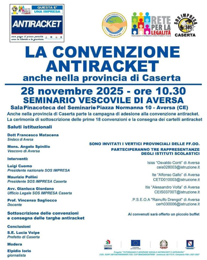 Il 28 novembre 2025, ad Aversa, si terrà la cerimonia di sottoscrizione delle prime 18 Convenzioni Antiracket promosse da SOS Impresa – Rete per la Legalità APS, con contestuale consegna dei cartelli antiracket alle imprese che hanno scelto di aderire con coraggio e responsabilità a questo percorso di tutela e impegno civile.