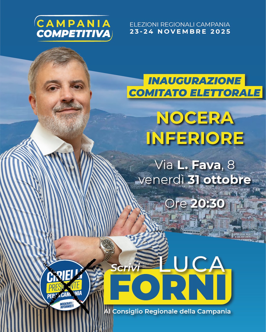 Il candidato al Consiglio Regionale della Campania Luca Forni, in lista civica con *Cirielli Presidente* , è lieto di invitare la cittadinanza, la stampa e tutti i sostenitori all’inaugurazione del suo comitato elettorale di Nocera Inferiore, che si terrà in Via L. Fava, 8 a Nocera Inferiore (SA) Venerdì 31 ottobre 2025 alle ore 20:30.