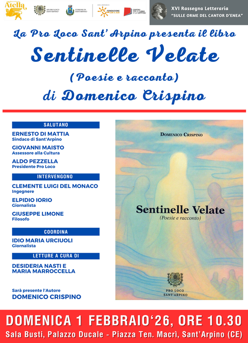 Domenica prossima, 1 febbraio 2026, alle ore 10.30, presso la Sala Busti del Palazzo Ducale “Sanchez de Luna”, in Piazza Ten. G. Macrì a Sant’Arpino (CE), la Pro Loco di Sant’Arpino presenta “Sentinelle velate. Poesie e racconto”, ultima fatica editoriale di Domenico Crispino, poeta atellano.