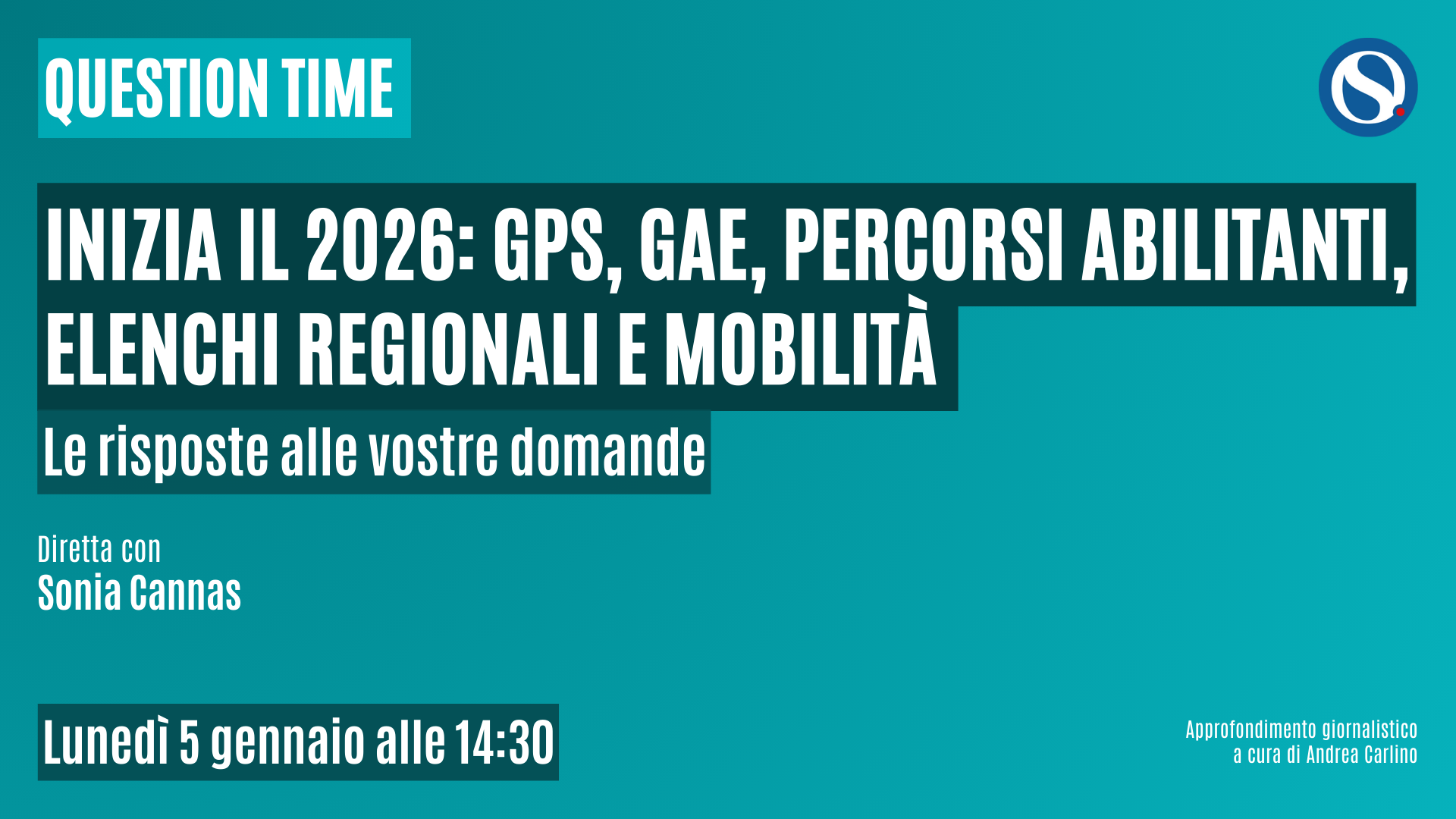 Inizia il 2026: GPS, GaE, percorsi abilitanti, elenchi regionali e non solo. QUESTION TIME con Cannas. LIVE Lunedì 5 gennaio alle 14:30