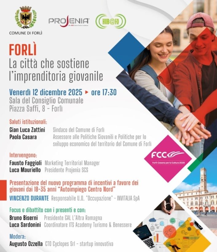 Forlì si prepara ad accogliere un appuntamento fondamentale per il futuro del territorio e dei suoi giovani: “Forlì – La città che sostiene l’imprenditorialità giovanile”, un incontro dedicato alle nuove opportunità di incentivo, crescita e accompagnamento per ragazze e ragazzi tra i 18 e i 35 anni che desiderano avviare un’impresa attraverso la misura “Autoimpiego Centro Nord” di Invitalia
