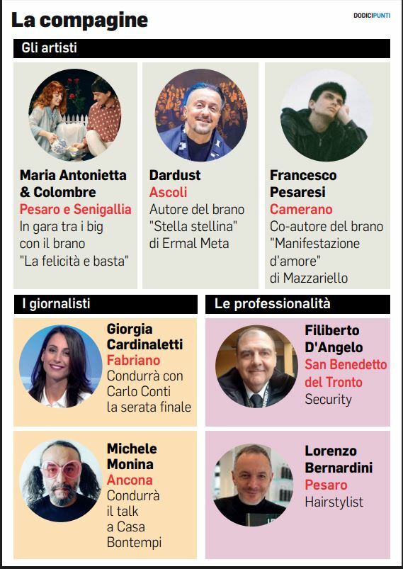 ANCONA Sopra e sotto il palco dell’Ariston, quest’anno si sentirà molto spesso l’inflessione marchigiana. Dalla cadenza pesarese di Maria Antonietta (Letizia Cesarini) a quella senigalliese del suo compagno Colombre (Giovanni Imparato) in gara tra i big con il brano La felicità e basta. L’accento pesarese attraverserà anche il backstage del Festival, nella voce dell’hairstylist Lorenzo Bernardini. «È il decimo anno che vengo chiamato – dice – parto domani (oggi per chi legge, ndr)». Artisti e conduttori avranno a che fare anche con la parlata sambenedettese, perché a proteggergli le spalle ci saranno i bodyguard della Fi.Fa. Security Network di San Benedetto del Tronto.
