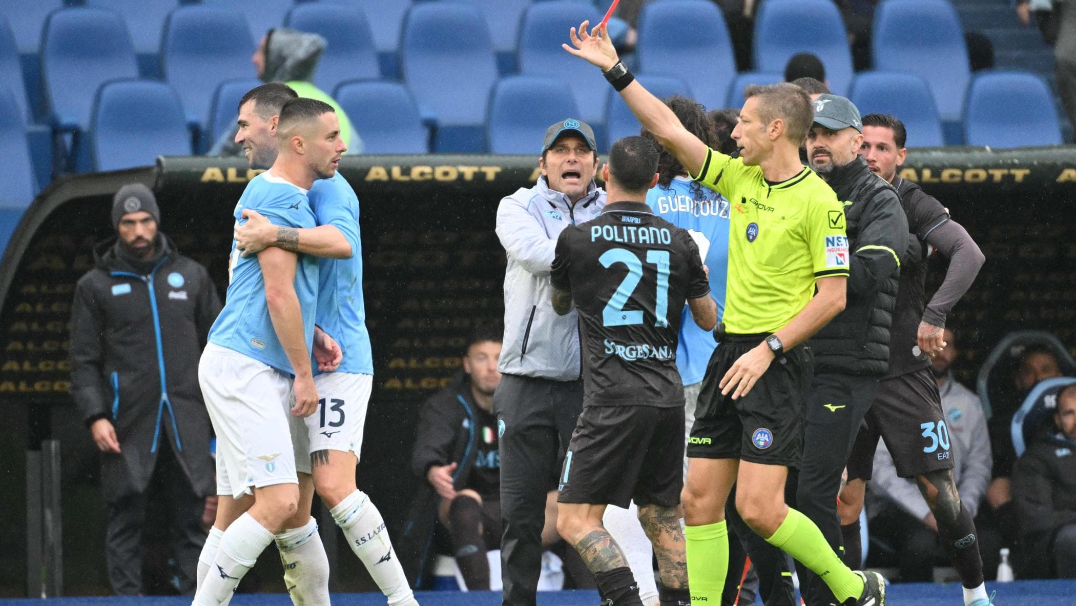 Lazio e Napoli, alta tensione. Due risse, tre espulsi e Conte deve entrare in campo: cosa è successo