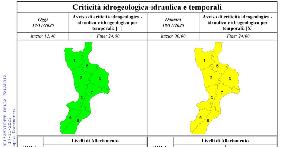 Allerta gialla a partire dalla mezzanotte e per tutto martedì 18 novembre 2025 in Calabria. E’ quanto comunica la Protezione civile, segnalando l’arrivo di piogge al centro-sud.