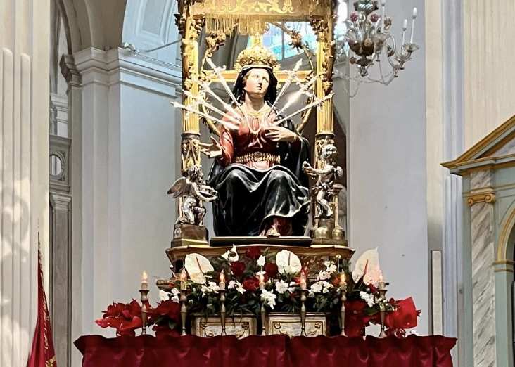 FERMO – Una tradizione molto sentita nella città di Fermo che si rinnoverà in Cattedrale dal 10 al 18 gennaio con il simulacro della Madonna dalle 7 spade che verrà trasferita in Duomo proprio in quei giorni. Il programma completo del Settenario.