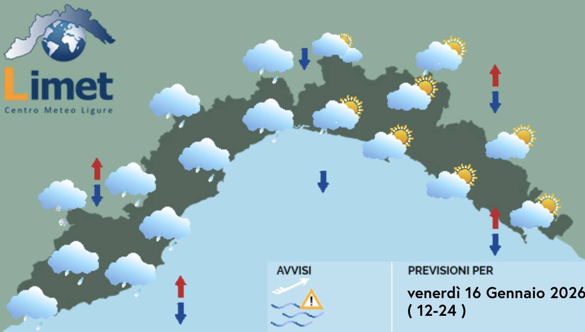 Nel pomeriggio le piogge tenderanno a concentrarsi a ponente, specie sui versanti padani ed assumeranno carattere nevoso oltre i 1400 metri sulle Alpi Liguri. A levante ed in tendenza sul centro attenuazione dei fenomeni con qualche schiarita.