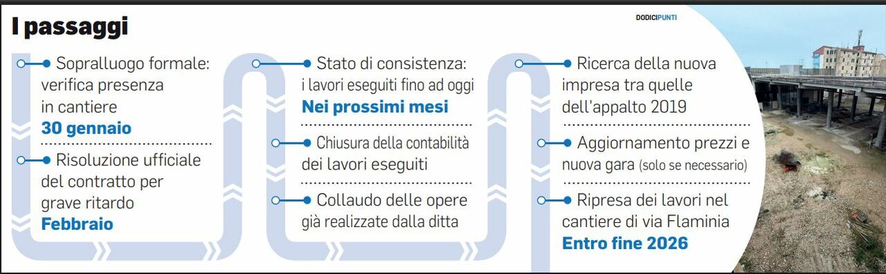 E vista la così lunga attesa, partire dalla fine, dal traguardo auspicato, non ci sembra irrituale. «L’Amministrazione punta a vedere il nuovo soggetto operante in cantiere entro la fine dell’anno» assicura Tombolini. Insomma, svanito l’obiettivo di completare l’opera entro l’anno in corso, almeno si spera di poter ripartire prima del prossimo Capodanno. Anche perché tra qualche settimana, a maggio 2026, sarà ufficialmente un anno che (quasi) tutto tace in via Flaminia, salvo una fugace ricomparsa della ditta verso novembre per alcune lavorazioni di fino. Tornando al presente, il primo step intermedio sarà quello del 30 gennaio, venerdì. Il Direttore dei lavori tornerà in cantiere per un sopralluogo formale di verifica dell’esecuzione dei lavori. Non ci troverà nessuno. Entro febbraio, invece, verrà perfezionata e licenziata la determina comunale per la risoluzione in danno dell’appalto con il Consorzio Rennova, «per gravi ritardi». Partiti nel febbraio 2021, i lavori si sarebbero dovuti concludere a inizio 2023. Così non è stato, e proprio il maxi-ritardo è al centro della disputa che ha portato Rennova ad abbandonare il cantiere.