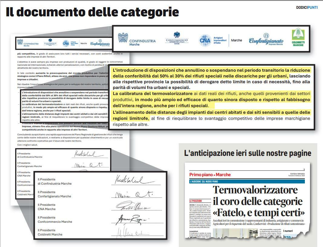 NCONA La matematica non è un’opinione: 459 osservazioni specifiche arrivate da 65 soggetti diversi al Piano regionale per la gestione dei rifiuti in fase di Valutazione ambientale strategica, chiusa lo scorso maggio. Ben 130 pagine di critiche e puntualizzazioni, la maggior parte delle quali contro discariche ed inceneritore: numero iperbolico che dà la cifra di quanto il tema desti interesse ad ogni livello. E quelle stesse criticità individuate in fase di Vas, riemergono anche adesso che la Regione, con delibera di giunta del 19 gennaio, ha rimesso in moto l’iter consiliare del documento stoppato dalla pausa elettorale. Adesso siamo nella fase delle audizioni degli stakeholders nella commissione Ambiente e Governo del territorio, passaggio propedeutico all’approdo del Piano in Consiglio regionale per l’approvazione definitiva. Giovedì è stata la volta delle categorie produttive – industria, artigianato, commercio, agricoltura e mondo delle cooperative – che si sono ritrovate tutte dallo stesso lato della barricata nel dire sì al termovalorizzatore. Non solo: nel documento firmato da Confindustria, Confartigianato, Cna, Confcommercio e Coldiretti si richiede espressamente una «calibratura del termovalorizzatore ai dati reali dei rifiuti, anche quelli provenienti dai settori produttivi, in modo più ampio ed efficace di quanto sinora disposto e rispetto al fabbisogno dell’intera regione, anche per i rifiuti speciali». E pure «l’allineamento delle distanze degli impianti dai centri abitati e dai siti sensibili a quelle delle regioni limitrofe, al fine di riequilibrare lo svantaggio competitivo delle imprese marchigiane rispetto alle altre». Il Piano regionale pone come criterio i 500 metri, ma molte osservazioni ne hanno chiesto la riduzione (altrettante, hanno invece chiesto di arrivare a 2mila metri). Un fronte compatto, quello delle imprese, che si scontra con il no gridato a pieni polmoni da ambientalisti, opposizioni politiche e anche molti cittadini contro il termovalorizzatore. Un tema complesso su cui proverà a fare chiarezza un incontro organizzato per sabato 21 alle 10, alla Domus Stella Maris di Ancona, da Progetto Marche Vive, con le conclusioni affidate al capogruppo in Consiglio regionale Michele Caporossi.