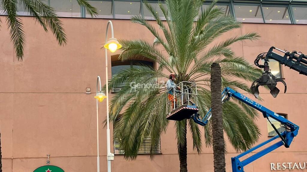 Genova. Procede l’abbattimento delle palme malate al Porto Antico nell’ambito di messa in sicurezza delle alberature cittadine messo a punto da Aster.