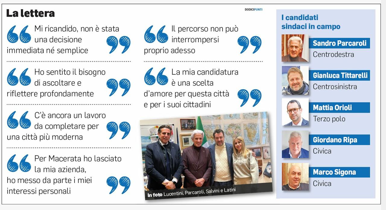 Parcaroli ha dunque definitivamente superato i dubbi che nelle ultime settimane avevano spinto tutti a credere possibile un suo ritiro dalle scene, ha avuto dalla coalizione di centrodestra quelle garanzie in particolare sulla composizione dell’eventuale futura giunta che lui cercava. Decisivo è stato il pressing del governatore Francesco Acquaroli, che negli ultimi giorni ha fatto sentire forte il suo sostegno al sindaco. E fondamentale è stata anche la Lega, il partito di Parcaroli, che non a caso ieri ancora prima che uscisse la lettera del sindaco lo aveva ringraziato per la disponibilità a ricandidarsi garantendogli supporto e aiuto per la campagna elettorale.