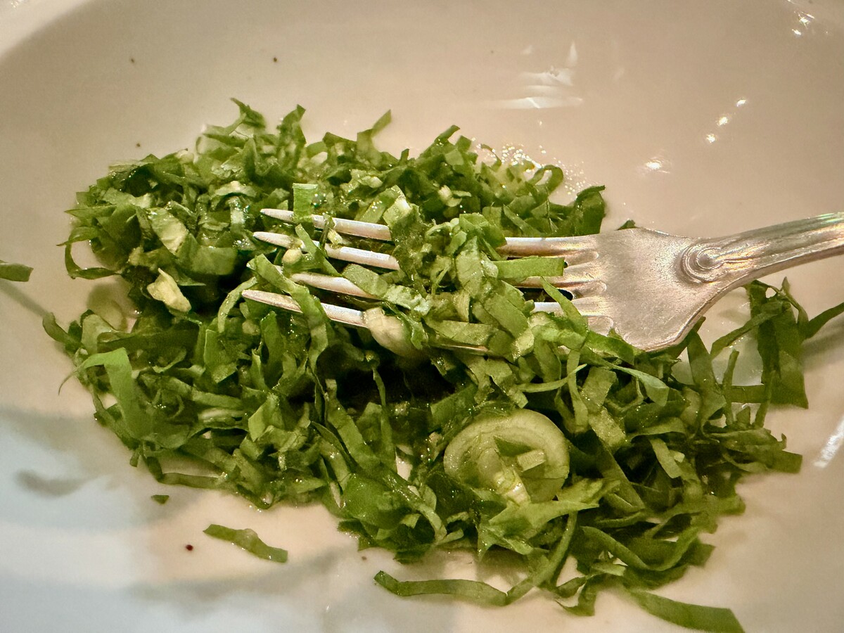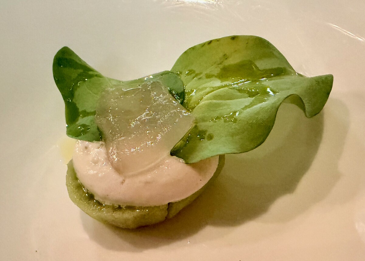 Il percorso gastronomico si addentra in una selva di ingredienti e lavorazioni in cui è facile smarrirsi, rendendo di fatto impossibile anche solo intuire i diversi passaggi del processo che ha portato ai singoli piatti. Si comincia con una Cicorietta che, con la sua inaspettata delicatezza capace di attutirne il classico sapore amarognolo, riesce – questa si! – ad ammaliare e a far ben sperare per il prosieguo del pasto.