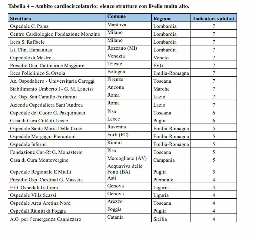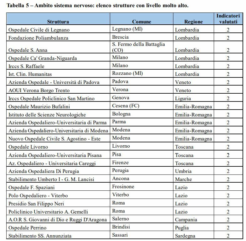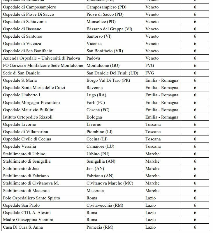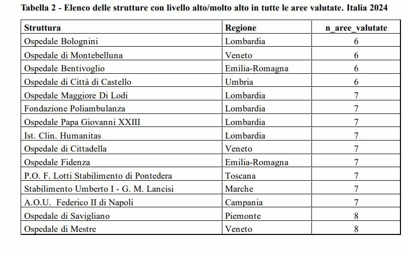 Sono 15 le strutture valutate su almeno 6 aree, che hanno raggiunto nel 2024 un «livello alto o molto alto». Tra queste il Presidio Ospedaliero Umberto I e G.M. Lancisi dell’Azienda Ospedaliero Universitaria delle Marche. Le altre sono: Ospedale Bolognini (Lombardia); ospedale di Montebelluna (Veneto); ospedale Bentivoglio (Emilia-Romagna); ospedale di Città di Castello (Umbria); ospedale Maggiore Di Lodi (Lombardia); Fondazione Poliambulanza (Lombardia); ospedale Papa Giovanni XXIII (Lombardia); Istituto Clinico Humanitas (Lombardia); ospedale di Cittadella (Veneto); ospedale Fidenza (Emilia-Romagna); Pof Lotti Stabilimento di Pontedera (Toscana); Aou Federico II di Napoli (Campania); Ospedale di Savigliano (Piemonte); Ospedale di Mestre (Veneto).