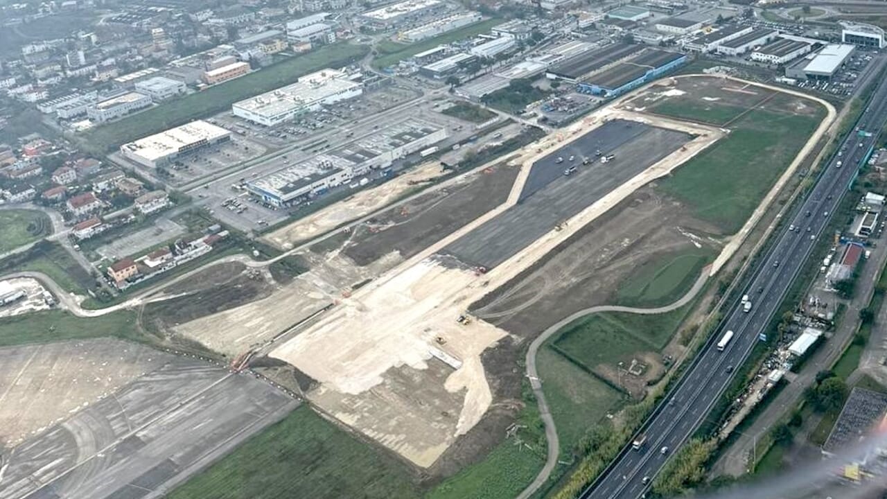Al momento sono in corso di realizzazione gli strati finali della pavimentazione: su metà della nuova superficie sono già stati stesi gli strati di conglomerato bituminoso, mentre nella fascia di attacco alla vecchia pavimentazione (pista attualmente in uso) si sta terminando il misto cementato.