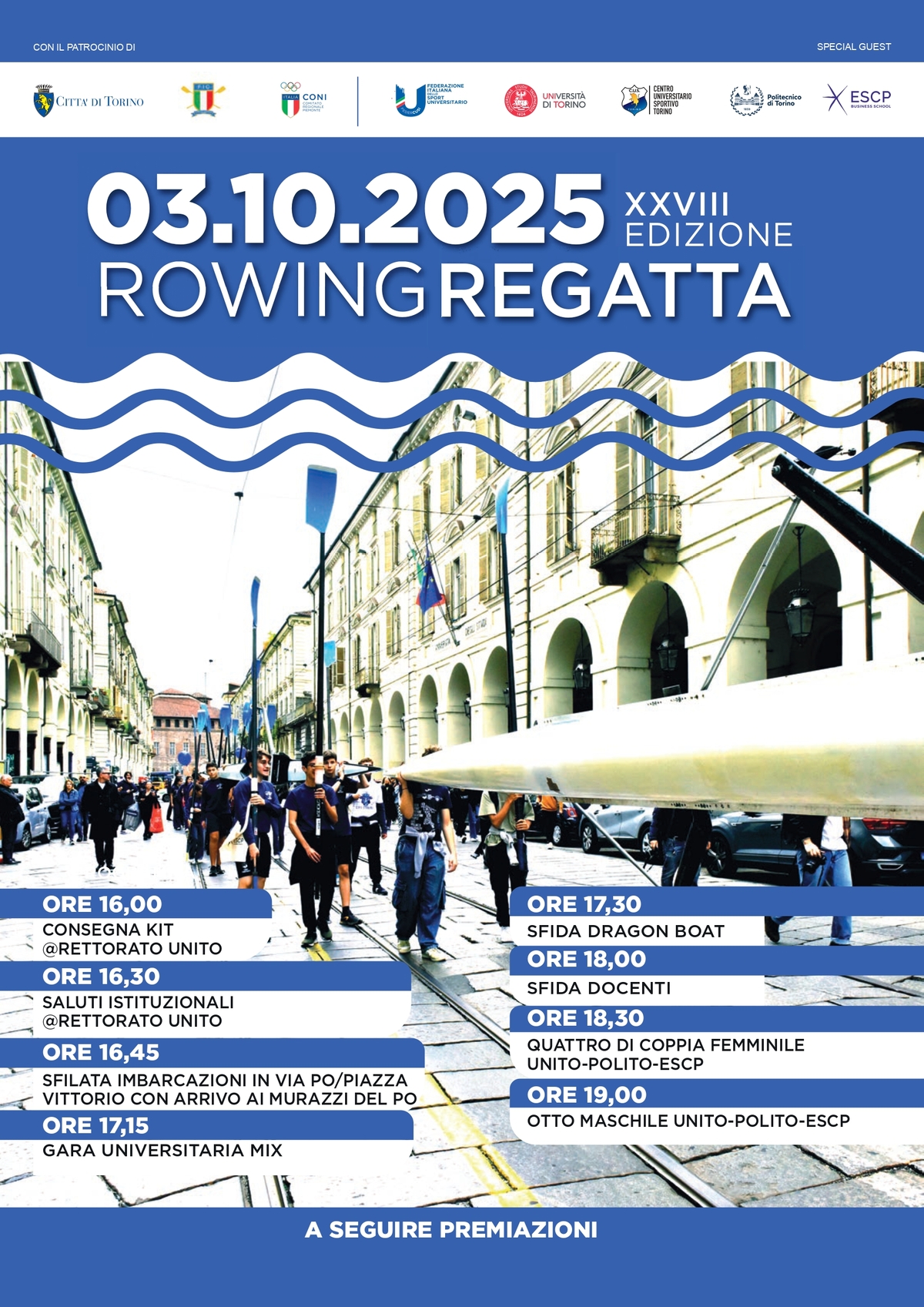 La giornata di venerdì 3 ottobre si aprirà con i saluti istituzionali alle ore 16:30 presso il Rettorato Unito, in via Verdi 8. A seguire, alle ore 16:45, prenderà il via la sfilata delle imbarcazioni lungo via Po e piazza Vittorio Veneto, fino ai Murazzi del Po, dove il pubblico potrà godersi il finale delle competizioni, che inizieranno alle 17.15.