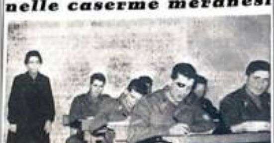 Nella foto, lo sguardo severo della maestra Luciana Manna parla da solo: non sarà una passeggiata per i militari di leva accasermati a Merano arrivare a prendere la licenza elementare. Novembre 1956: l’Italia soffre ancora di una grave arretratezza culturale. Si calcola che più del 10 per cento della popolazione sia analfabeta. A questi vanno aggiunti i semi-analfabeti e chi non ha mai raggiunto la licenza elementare o media. E così le caserme si attrezzano per ricavare ore da dedicare alla formazione scolastica di base di quei soldati che non hanno avuto l’opportunità di sedere tra i banchi da bambini. «Sono stati inaugurati presso la caserma “Cesare Battisti” – riporta l’Alto Adige -, sede del 5° Reggimento Artiglieria, i corsi d’istruzione per i soldati in armi. Si tratta di corsi per analfabeti, o corsi medi e superiori, per allievi che non abbiano ultimato il percorso d’istruzione, oltre ad un corso di cultura generale (politica, geografia, storia e cultura religiosa). I primi corsi, quelli per ottenere la licenza elementare, vengono impartiti da maestri e maestre delle scuole meranesi; quelli di cultura generale sono tenuti invece da alcuni ufficiali designati dal comando di Reggimento. Analoghi corsi, per due ore al giorno, sono stati iniziati in tutte le altre caserme del presidio». Nel dopoguerra l’Esercito italiano diventò anche una scuola. Dal 1946 nelle caserme furono avviati i primi corsi di alfabetizzazione per i giovani di leva che non avevano conseguito la licenza elementare. L’iniziativa, poi regolamentata nel 1947, rispondeva a un’urgenza nazionale: migliaia di ragazzi, soprattutto dalle aree rurali, arrivavano alla chiamata alle armi senza istruzione di base. Il servizio militare divenne così un’occasione per colmare il divario educativo, offrendo ai coscritti la possibilità di ottenere il titolo minimo di studio e contribuendo alla lotta all’analfabetismo che caratterizzò l’Italia del dopoguerra.