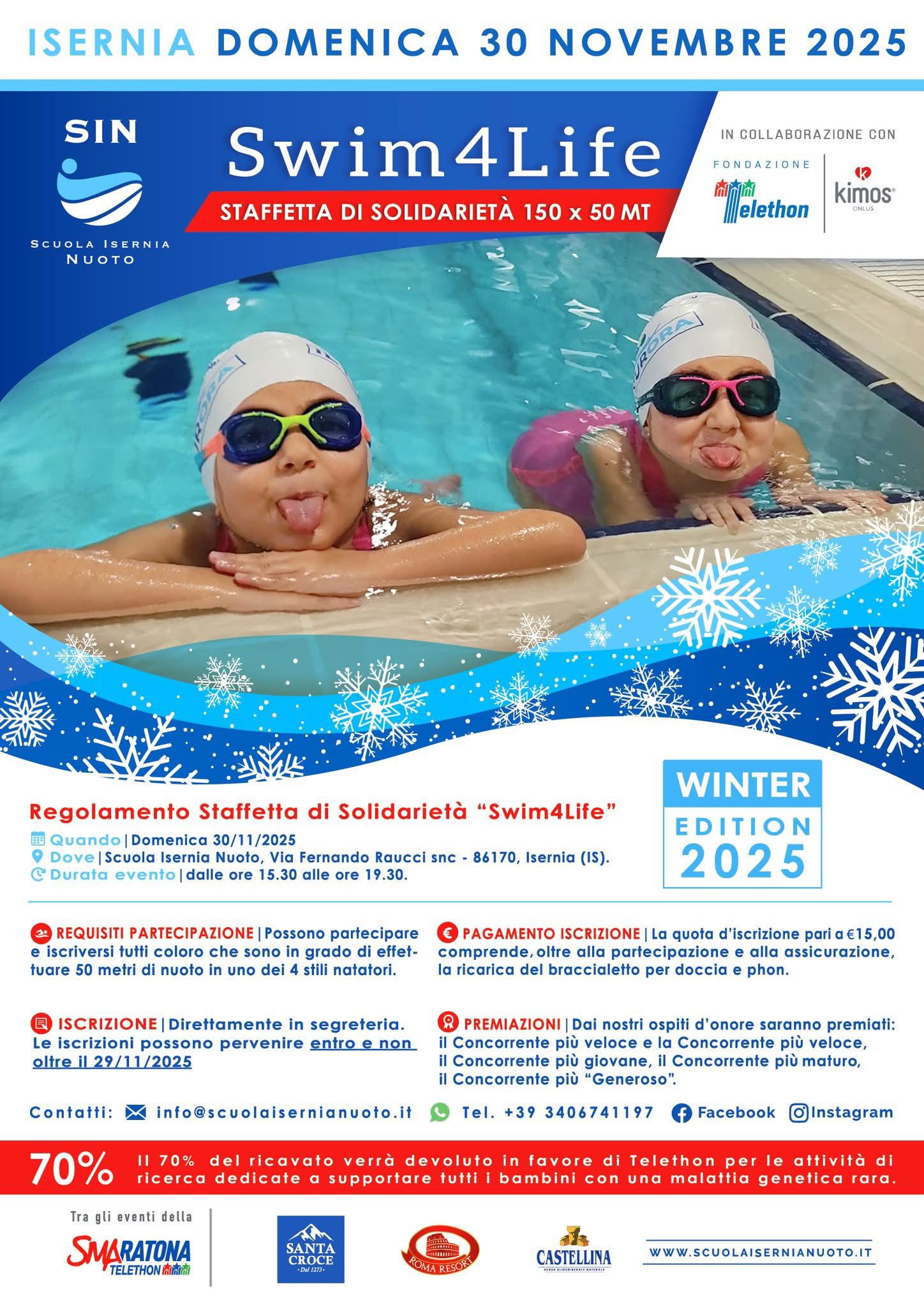 ISERNIA. La Scuola Isernia Nuoto presenta la Terza Edizione della SWIM4LIFE, la grande staffetta solidale 150 x 50 metri, in programma domenica 30 novembre dalle ore 15.30 presso l’impianto di via Fernando Raucci. L’evento, organizzato in collaborazione con Fondazione Telethon e Kimos Onlus, rappresenta uno degli appuntamenti principali della SMAratona Telethon – Città di Isernia. Come ogni anno, l’obiettivo è chiaro: il 70% del ricavato sarà devoluto a Telethon per supportare la ricerca sulle malattie genetiche rare dei bambini.