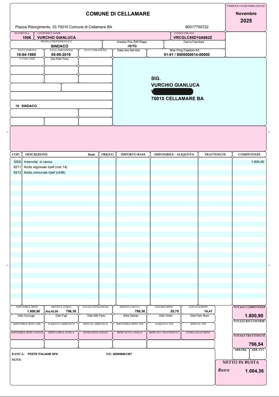 “Non mi sono mai nascosto – spiega il sindaco Vurchio -. Ho pubblicato qualche volta la certificazione unica, cumulativa, relativa agli emolumenti del Comune di Cellamare ed ora pubblico il cedolino paga specifico della mensilità di novembre 2025. Ecco a voi la mia indennità di sindaco: un lordo di 1800,90 euro a cui vanno detratti scarse 800 euro di trattenuta IRPEF (aliquota applicata 42%), per un netto complessivo di circa 1000 euro al mese per il mio ruolo di sindaco del comune di Cellamare”.