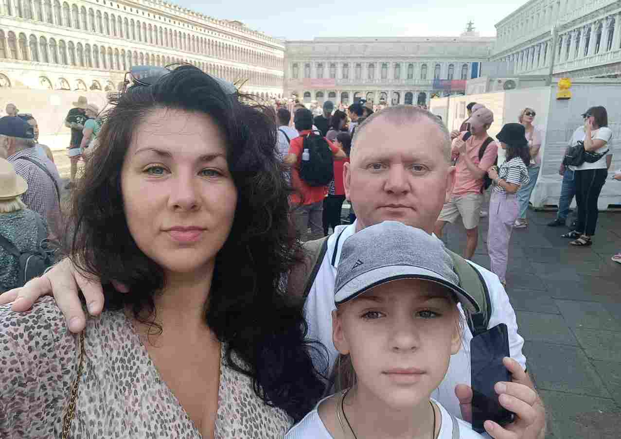 Natalia Lomakina con il marito Oleksandr Lomakin e la figlia Daria a Venezia. Nell’incidente è perita la piccola.