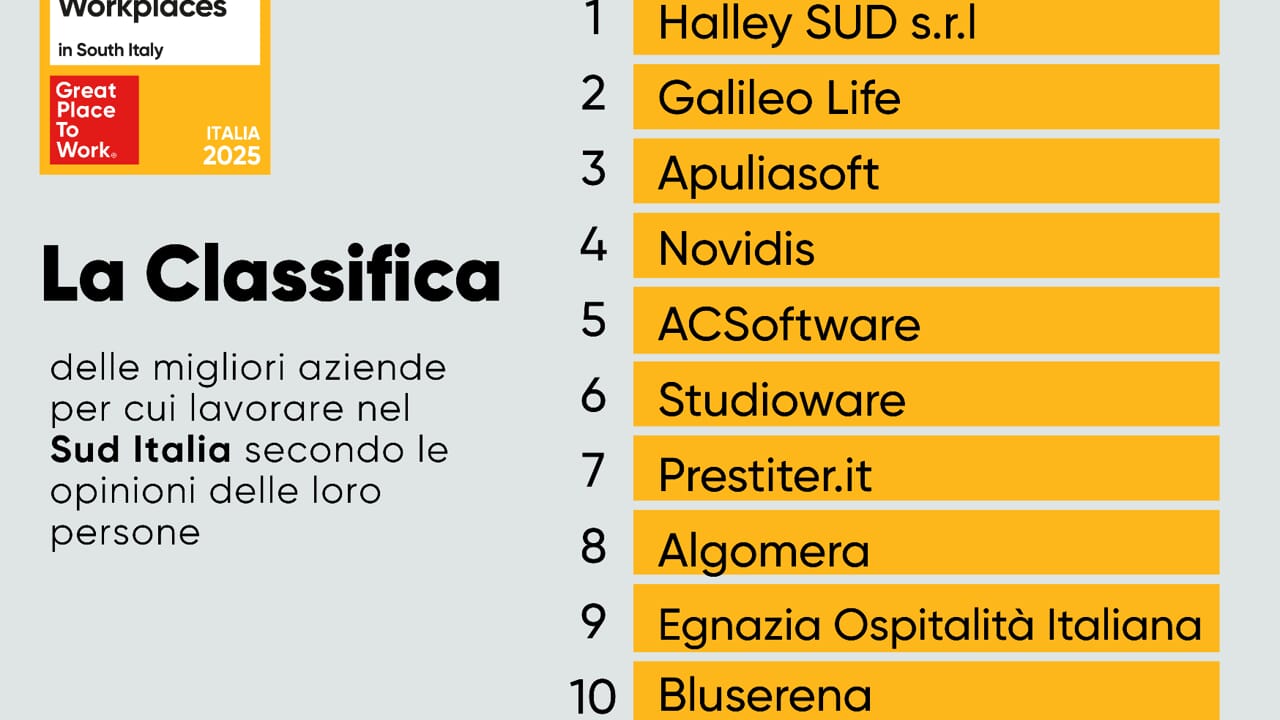 Ma quali sono le 10 migliori aziende per cui lavorare nel Sud Italia? Al primo posto, sul gradino più alto del podio, troviamo Halley Sud, realtà specializzata nella fornitura di soluzioni informatiche e servizi digitali per la Pubblica Amministrazione che rappresenta un punto di riferimento per gli enti locali delle regioni meridionali. Ha tre sedi dirette, situate a Catania, Sommatino (Ci) e Reggio Calabria a cui si aggiungono tre rivenditori strategici localizzati a Santa Teresa Riva (Me), San Giovanni Gemini (Ag) e Carini (Pa). Al secondo posto c’è GalileoLife, la grande rete di farmacisti italiani indipendenti, uniti per garantire il benessere della persona e delle comunità con sede a Maglie, in provincia di Lecce mentre conquista il gradino più basso del podio Apuliasoft, organizzazione del settore IT con sede a Bari che aiuta le aziende software-based a raggiungere obiettivi d’innovazione realizzando soluzioni software tailor-made innovative e offrendo consulenza e advisory in differenti domini industriali.
