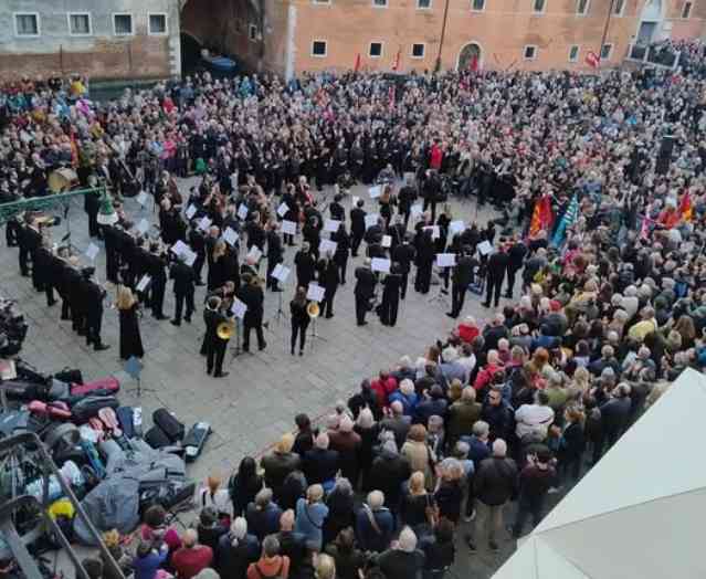 Venezia. Migliaia di persone si sono radunate ieri sera in campo Sant’Angelo per sostenere i lavoratori del Teatro La Fenice, in sciopero contro la nomina di Beatrice Venezi a direttrice musicale. La manifestazione, organizzata come un concerto-assemblea, ha sostituito la prima dell’opera Wozzeck di Alban Berg, annullata a seguito dello sciopero proclamato da orchestra, coro e maestranze.